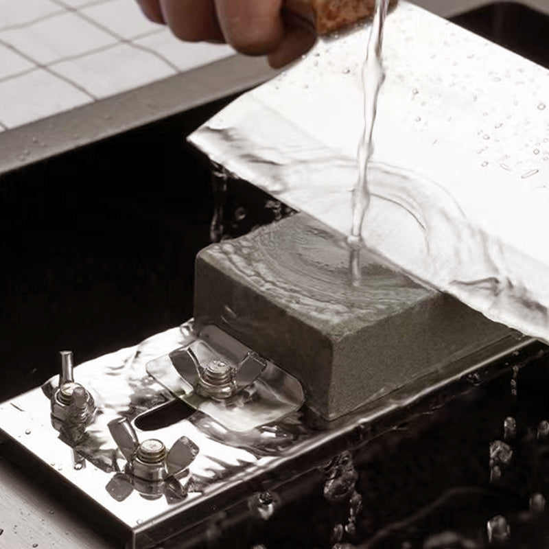 FULLY ADJUSTABLE STABLE SYSTEM: The reinforced bolt mechanism allows millimeter-perfect positioning of both the whetstone and mounting clamp. Adjust the stone holder from 8cm to 24cm to fit any blade length, while the expandable base (27-46 cm) securely fits most sink configurations. Locking knobs eliminate slippage mid-sharpening.