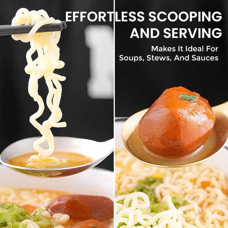 EFFORTLESS SCOOPING AND SERVING – The deep stainless steel ladle features an extra-deep design that effectively reduces spills and drips. Its raised edges ensure smooth pouring, making it ideal for soups, stews, and sauces.