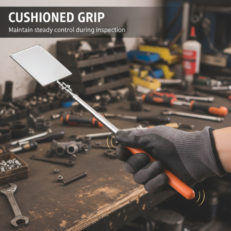 ERGONOMIC CUSHION GRIP - Features a comfortable, non-slip cushioned handle that provides a secure hold, reducing hand fatigue during extended use and ensuring precise control when maneuvering the mirror into position.